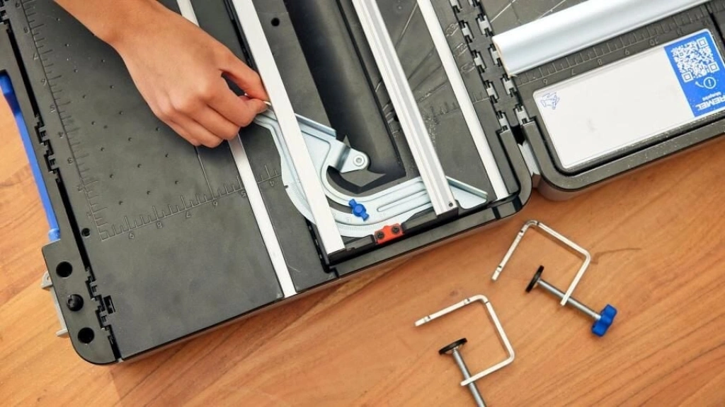 Kit, kesme kılavuzları, malzeme destekleri ve çalışma malzemesini sıkıca sabitlemek için kelepçeler içerir.