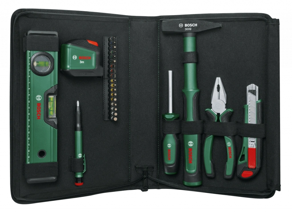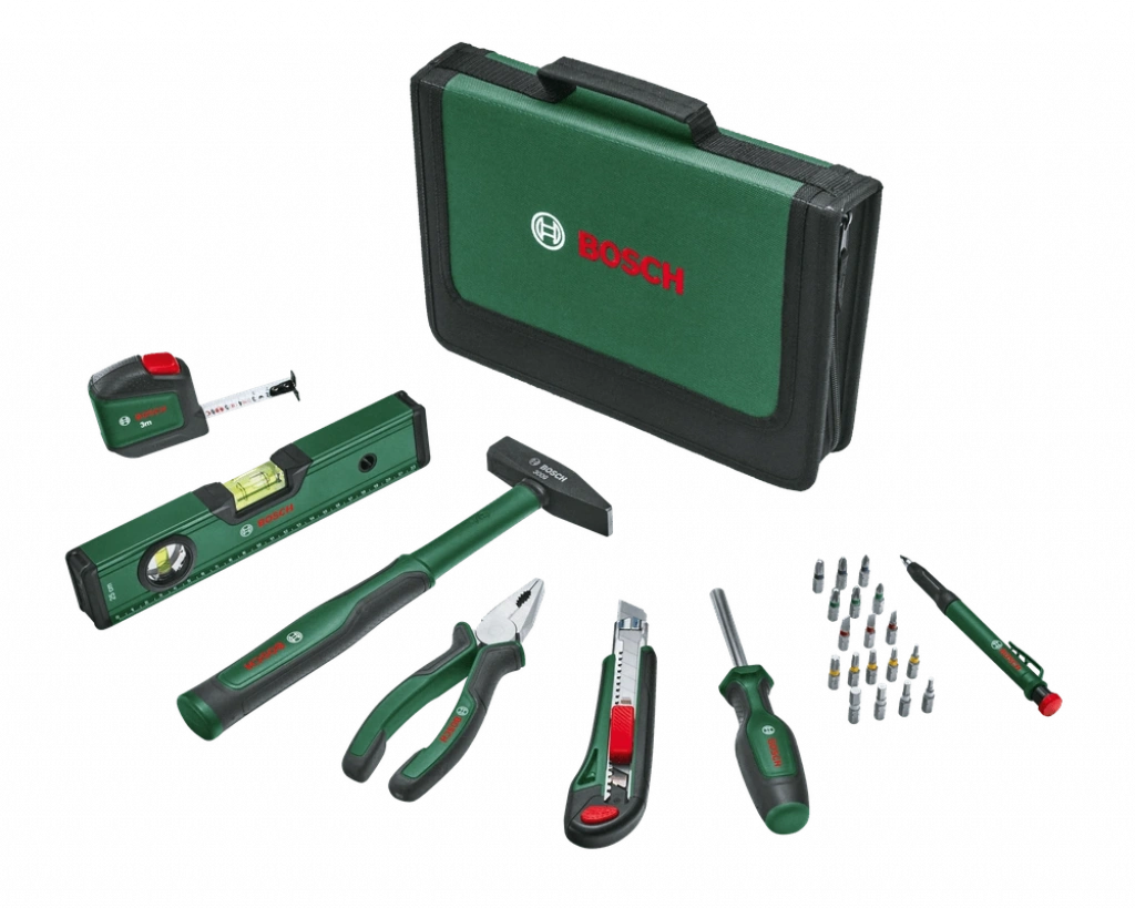 Set içerisinde pense, universal tornavida, 300 gr fiberglas çekiç, biz iğnesi, 3 metrelik şerit metre, 25 cm su terazisi, işaretleme kalemi ve 18 adet farklı boyutta uç bulunur.
